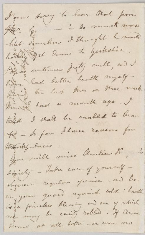 You will miss Amelia Ringrose’s society – Take care of yourself – observe regular exercise – and be on your guard against cold: hea[l]th is a priceless blessing and one of which we may be easily robbed. If Anne seems at all better – or even no worse in a week or two I will let you know