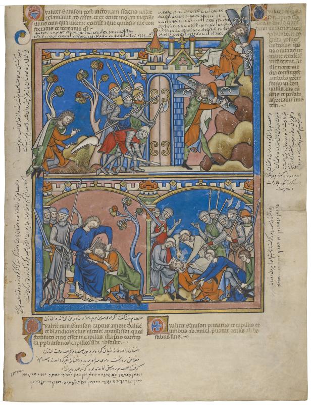 Lower left, beneath Persian: [Upon] Samson’s telling his wife, "My strength is attached to the hair on my head," she cuts it off with [a pair of] scissors; his strength declines, [then] she captures him and gives him to the Philistines to blind him.