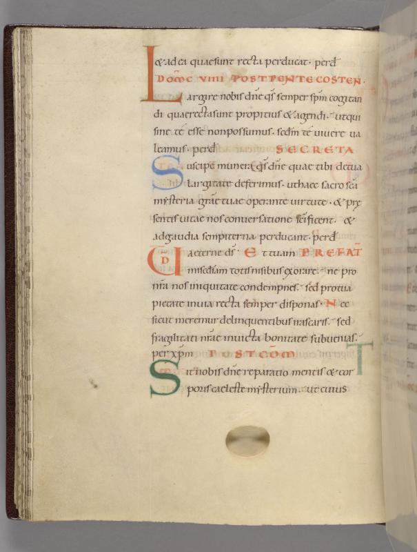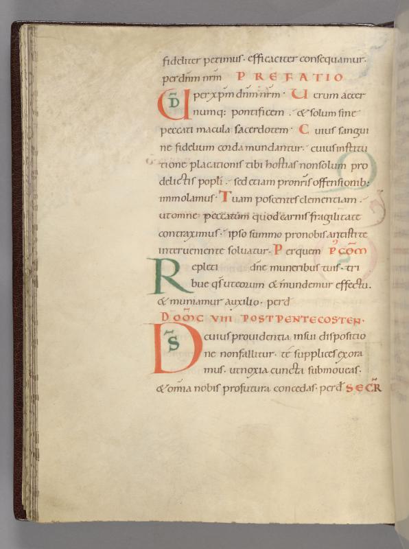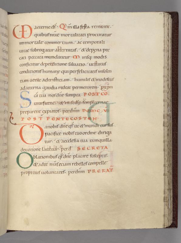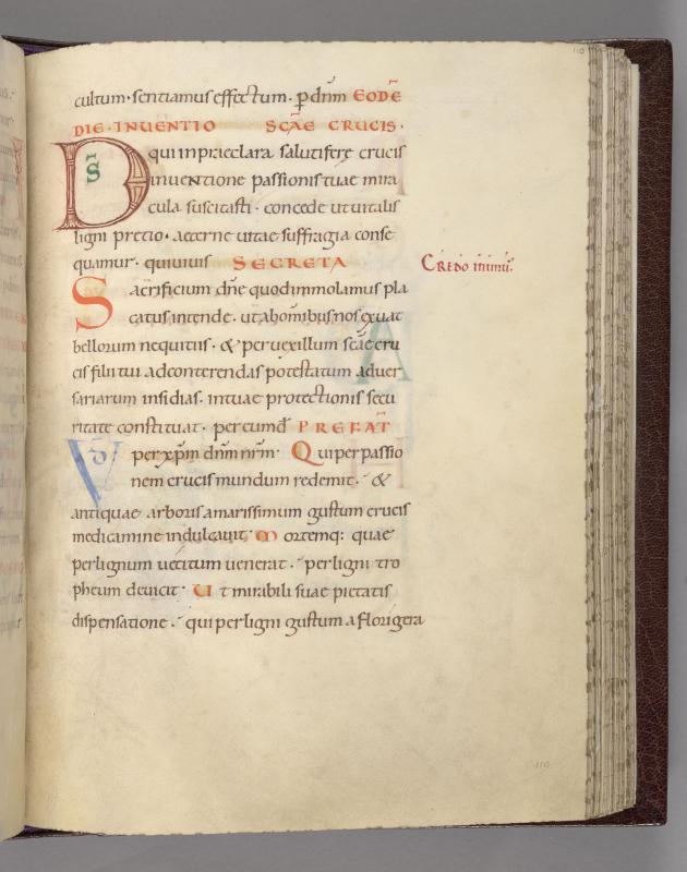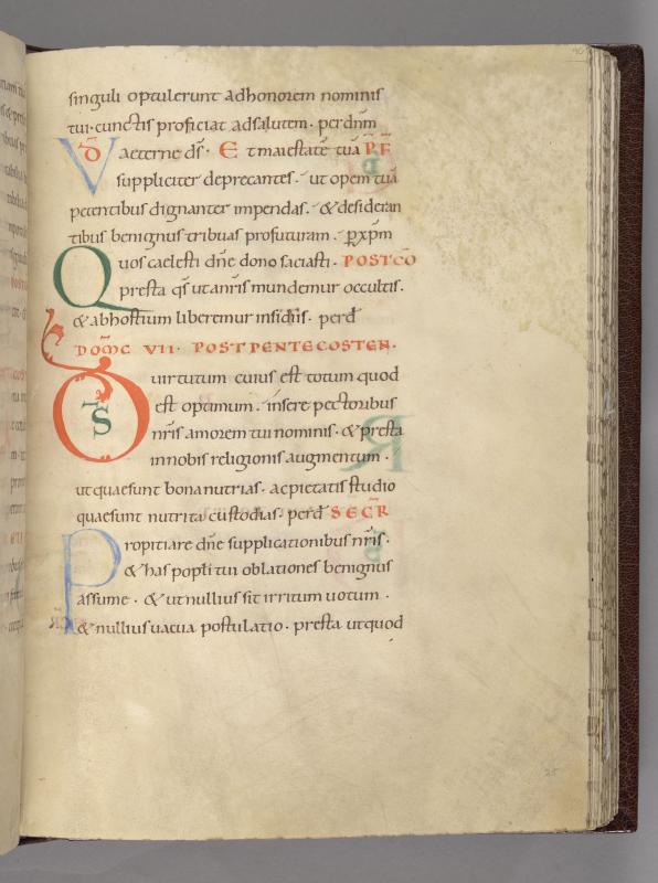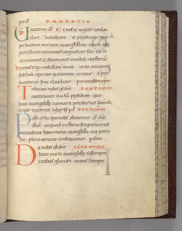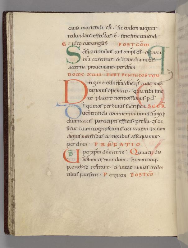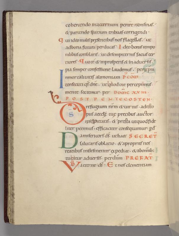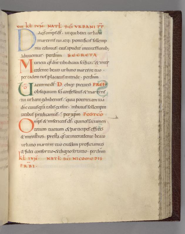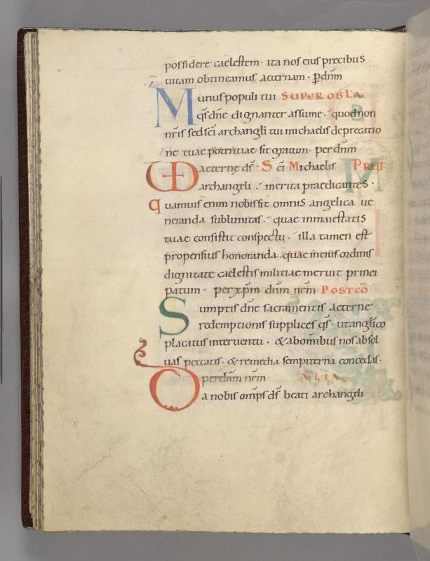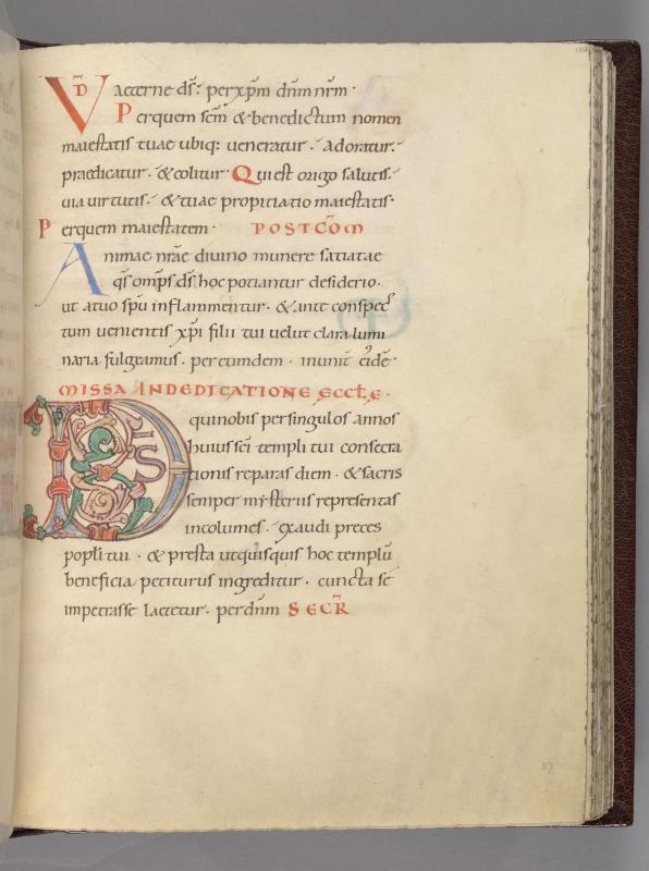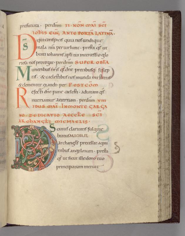 Scene within initial D decorated with interlace, at beginning of Collect for Feast of Annunciation.