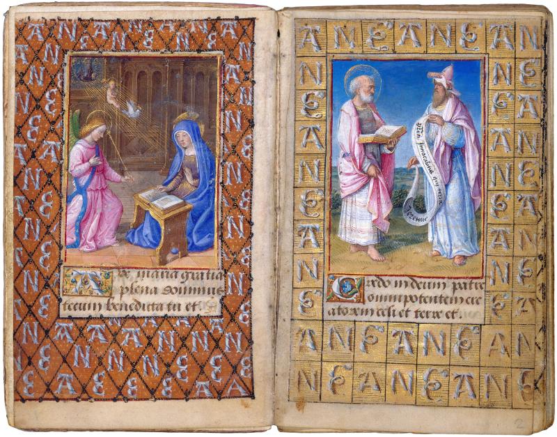 The Virgin Mary, surprised at her prayers, raises her eyes at Gabriel's announcement that she has been chosen to be the Mother of God. The miniature accompanies the Hail Mary.