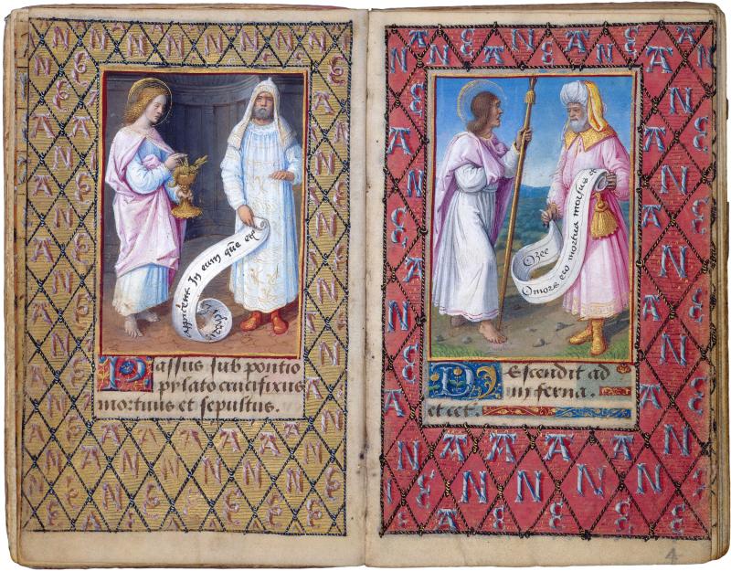 The active communication between the two figures is a visualization of the link between the Old and New Testaments, between the Articles of the Apostles' Creed and the declarations of the prophets. The pairing of Apostles and prophets in Anne's manuscript draws on a tradition dating back to the early fourteenth century.