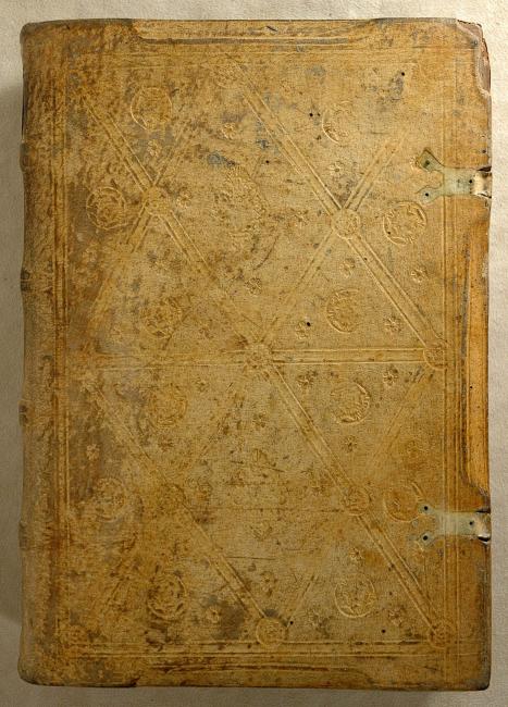15th-century blind-stamped pigskin over partially-bevelled wooden boards (32 x 22.5 cm.), sewn on 4 supports by the Doppeladler Wappen IV workshop, probably located near Basel (EBDB w003469, the other identified binding is St. Gallen, Ms 851). Modern plain paper pastedowns, with contemporary fly leaves; decorative endbands. 2 clasps, missing.