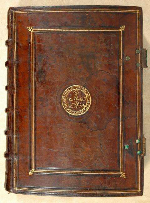 16th-century Lyon gilt- and blind-tooled calf over wooden boards (34 x 25 cm), sewn on 6 supports. Plain vellum pastedowns and endleaves; decorative endbands; gilt edges. 2 clasps, hinges repaired; clasps attached to front board.