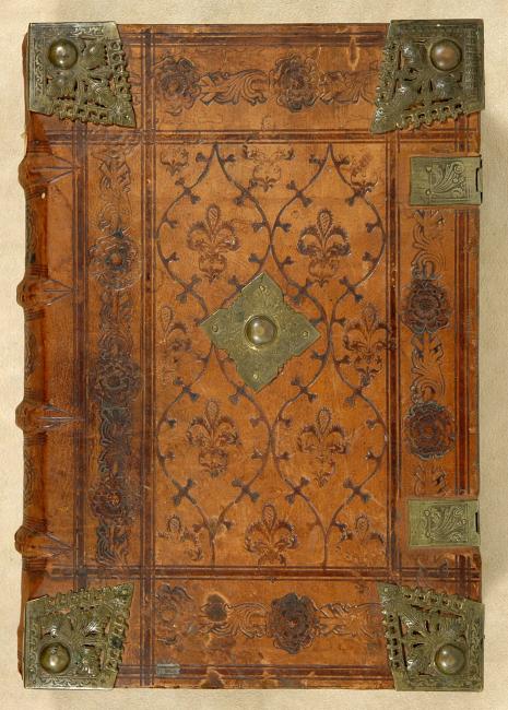 Contemporary German blind-stamped calf over wooden boards (31 x 20.5 cm.), sewn on 4 supports by the Blumenstock I workshop, Nuremberg (EBDB w002165, Kyriss 116, a.k.a. Hieronymus Münzer-Meister, active 1472-1490). Corner pieces and central boos; 2 clasps, 1 wanting. Plain paper pastedowns; plain endbands; edges colored yellow. Later spine label: "Aulus Gellius 1849."