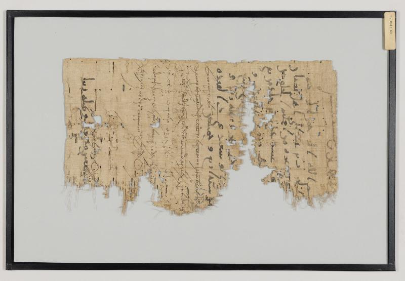 The entagion was cut from the top of a roll of papyrus. Top, bottom, and left margins are intact, the right badly damaged. The protocol (a protective cover at the beginning of a papyrus roll, bearing caliph/governor's name and formulae) suggests that this entagion comes from the time of Umayyad caliph Muawiya (40-60 AH / 661-80 CE).