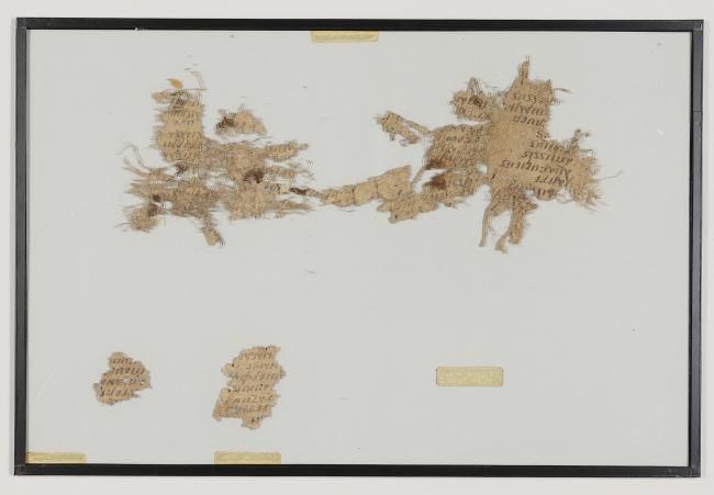 1 pane of glass containing 6 papyrus fragments ; 4 x 4 inches; 1 x 1 inches