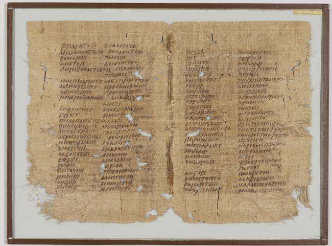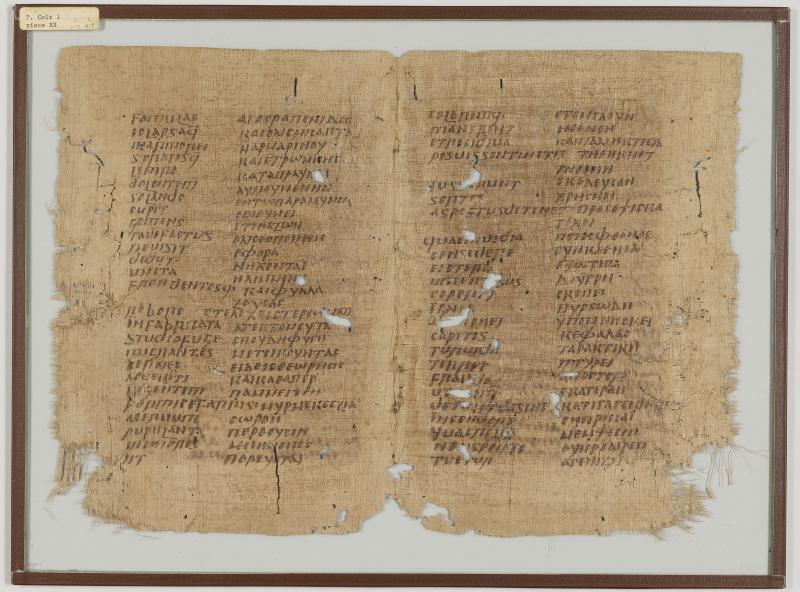 1 pane of glass containing 1 papyrus fragment ; 11 x 15 inches