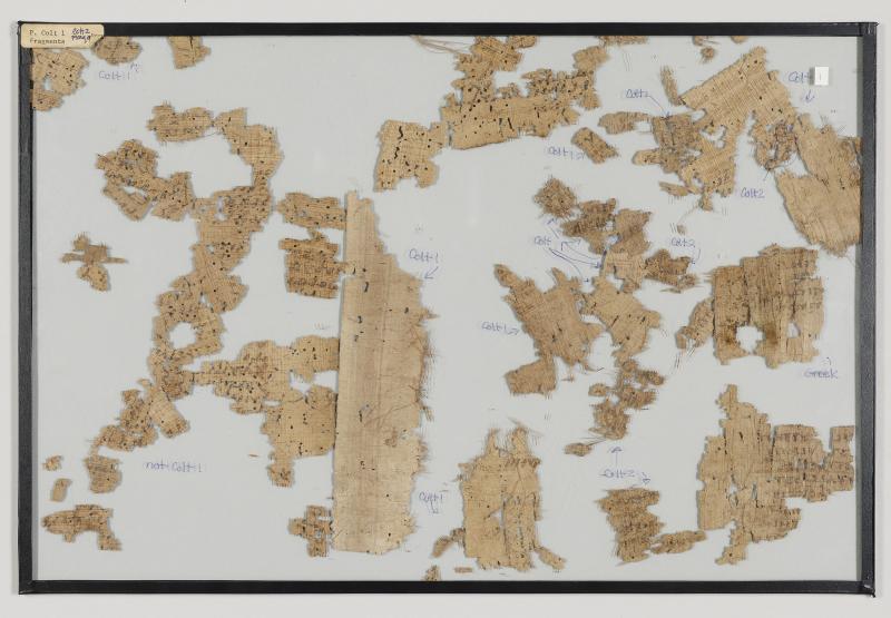 1 pane of glass containing many papyrus fragments ; 7 1/2 x 2 in.; 1/2 x 1/2 in.