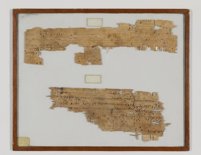 1 pane of glass containing 2 papyrus fragments ; 13.5 x 4 in.; 11 x 5 in.