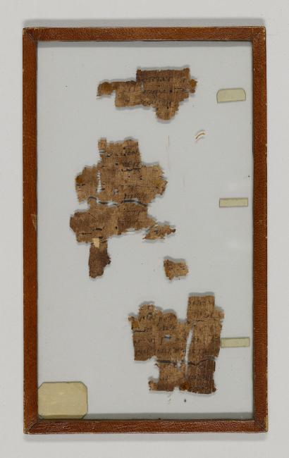 1 pane of glass containing 8 papyrus fragments ; 1 x 2.5 in.; 3 x 2.5 in.; 2.5 x 2.5 in.