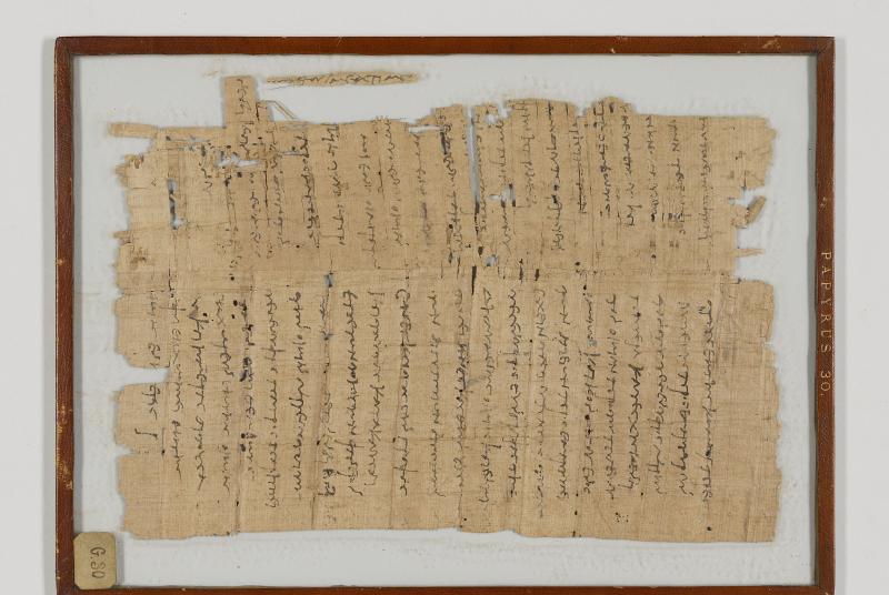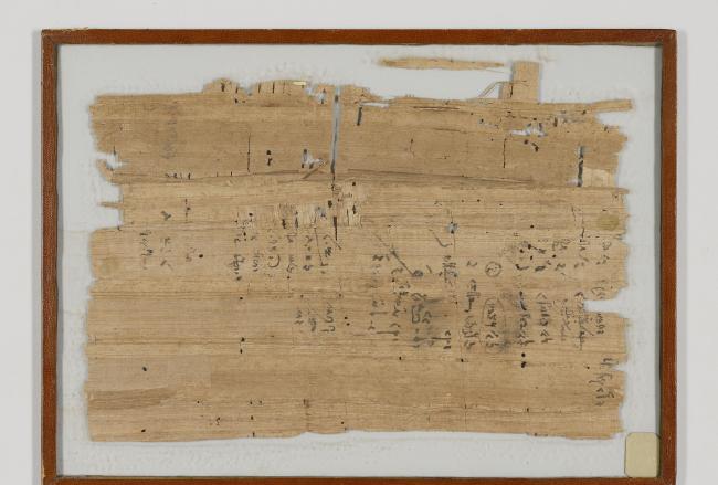 1 pane of glass containing 1 papyrus fragment ; 13 x 8.5 inches