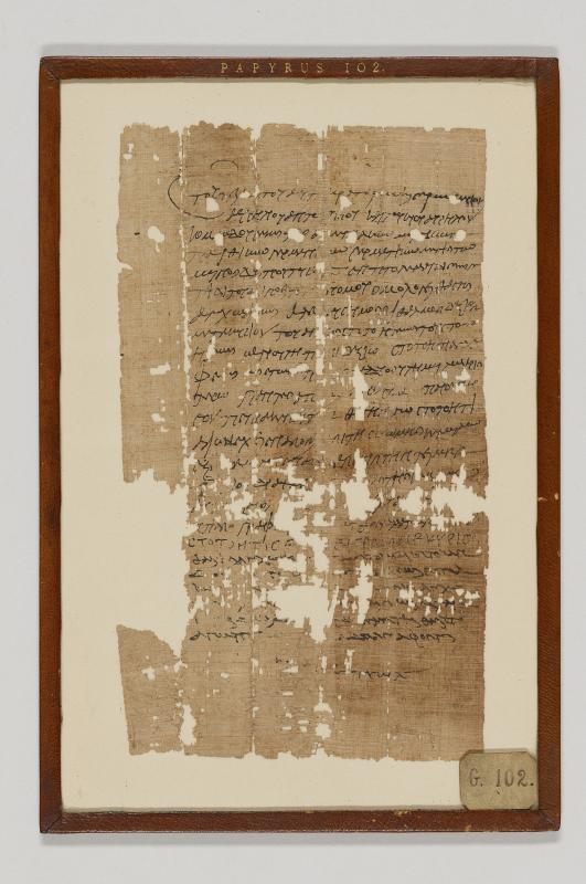 1 pane of glass containing 1 papyrus fragment ; 9 x 5 inches