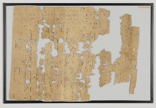 1 pane of glass containing 3 papyrus fragments ; 12 x 12 inches and smaller