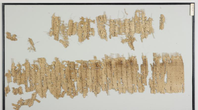 1 pane of glass containing many papyrus fragments ; 20 x 7 inches
