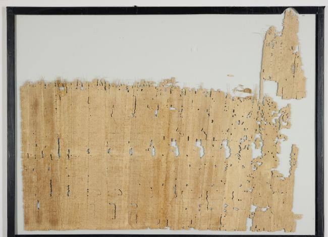1 pane of glass containing 2 papyrus fragments ; 21 x 12 inches