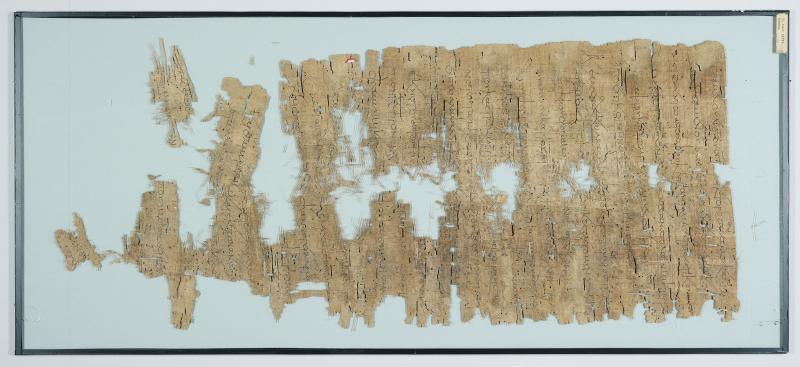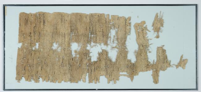 1 pane of glass containing 3 papyrus fragments ; 30 x 13 inches