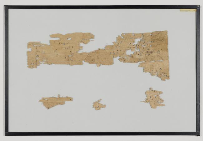 1 pane of glass containing 4 papyrus fragments ; 5 x 13 inches
