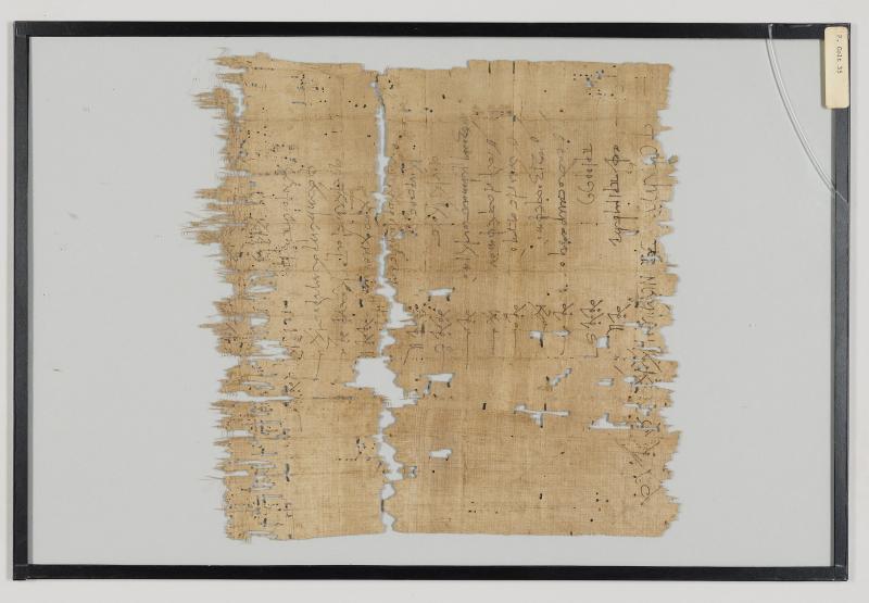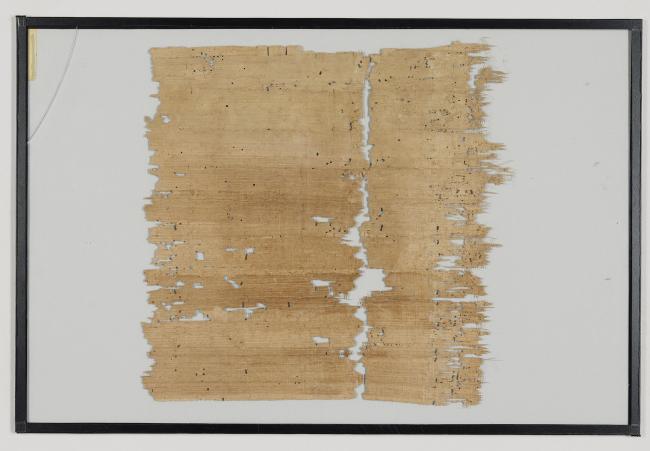 1 pane of glass containing 2 papyrus fragments ; 10 x 10 inches