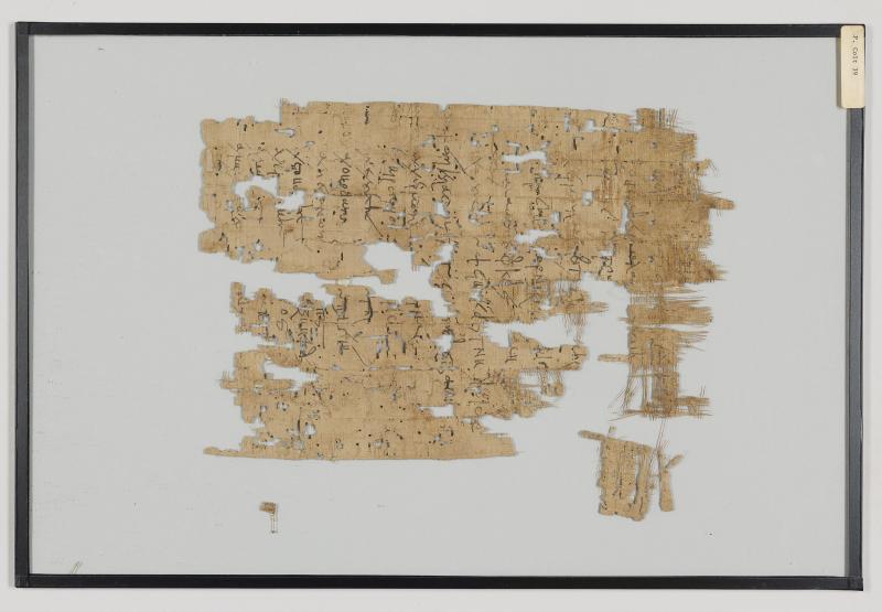 1 pane of glass containing 4 papyrus fragments ; 11 x 8 inches