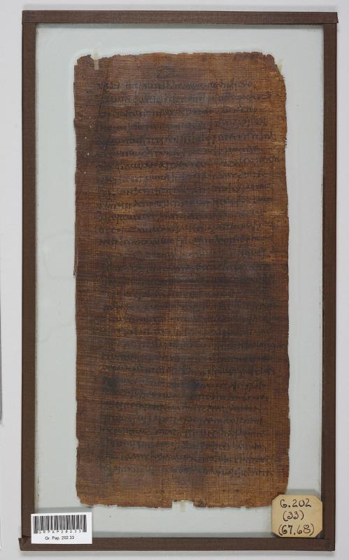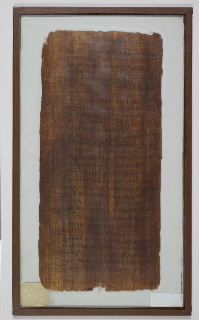 1 pane of glass containing 1 papyrus fragment ; 10.5 x 5.5 inches