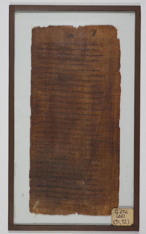 1 pane of glass containing 1 papyrus fragment ; 10.5 x 5.5 inches