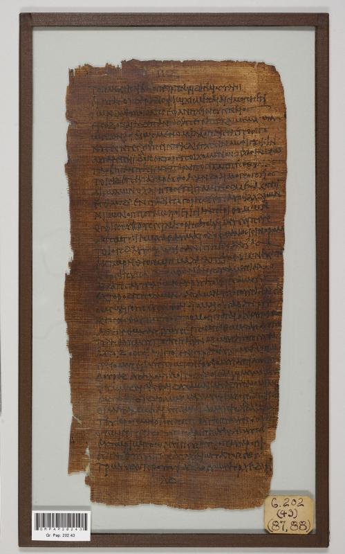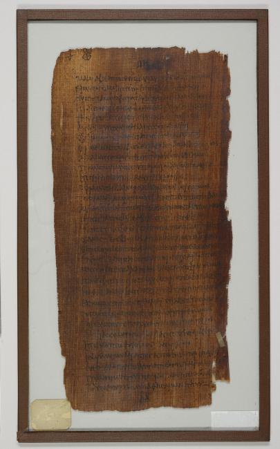 1 pane of glass containing 1 papyrus fragment ; 10.5 x 5 inches