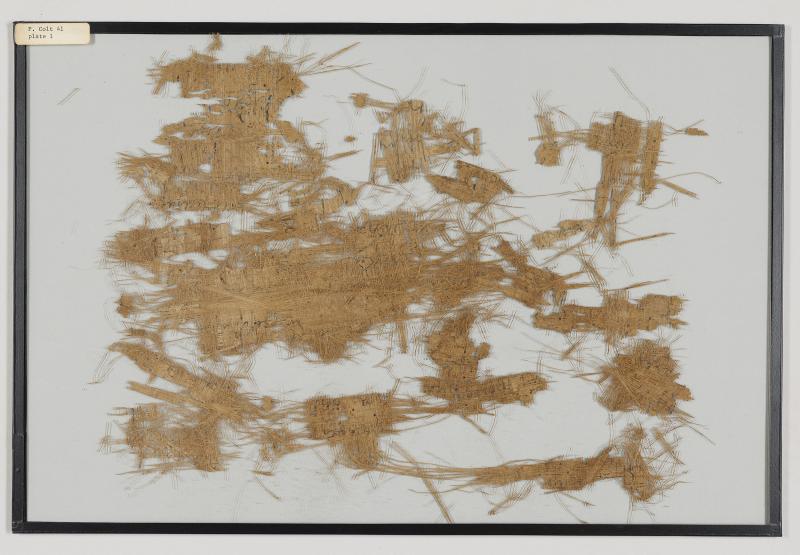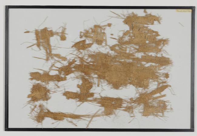 1 pane of glass containing many papyrus fragments ; 10 x 13 inches