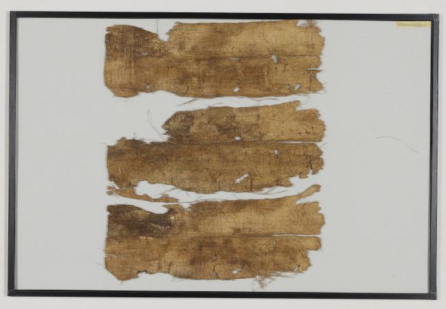 1 pane of glass containing 3 papyrus fragments ; 9 x 3 inches