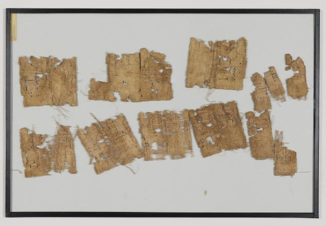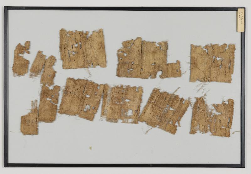 1 pane of glass containing many papyrus fragments ; 3 x 3 inches
