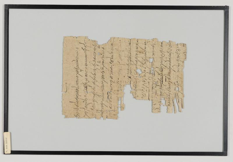 1 pane of glass containing 1 papyrus fragment ; 10 x 7 inches