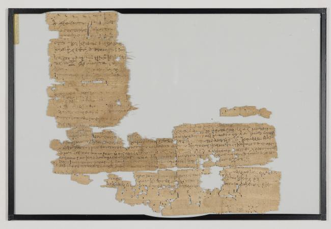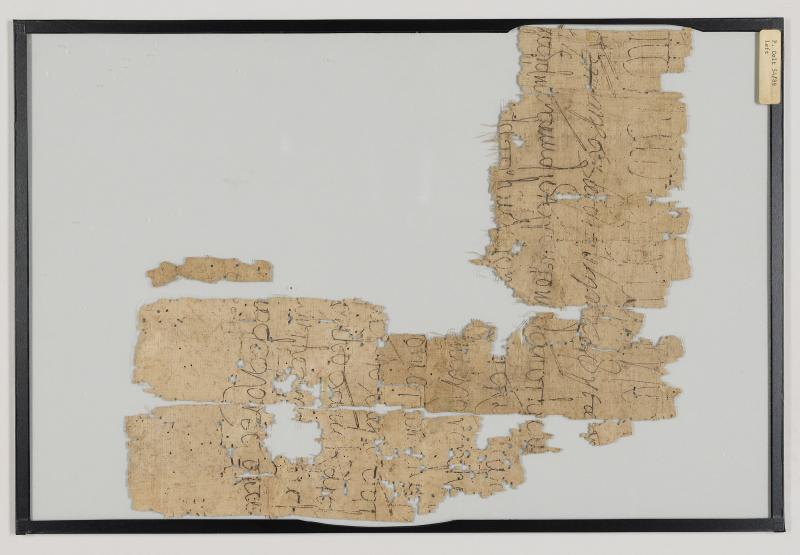 1 pane of glass containing 1 papyrus fragment ; 13 x 12 inches