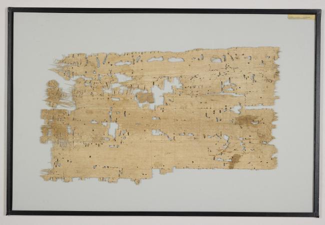 1 pane of glass containing 1 papyrus fragment ; 7 x 14 inches