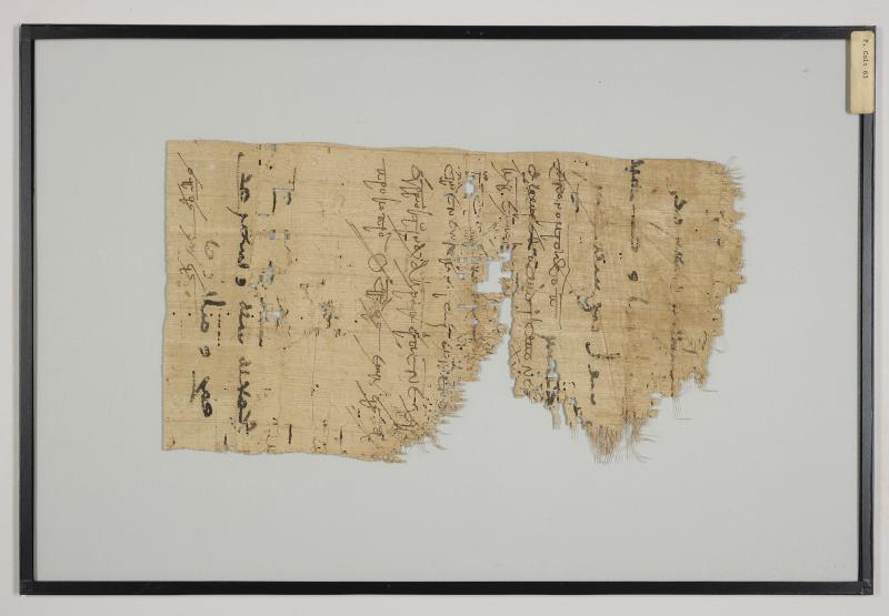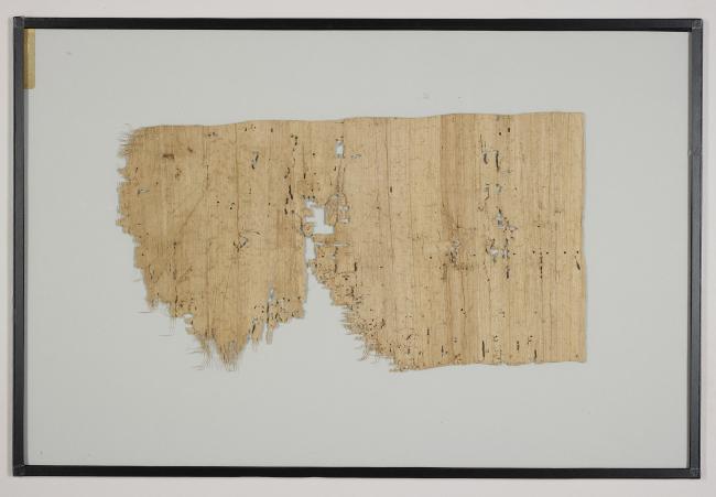1 pane of glass containing 1 papyrus fragment ; 12 x 7 inches