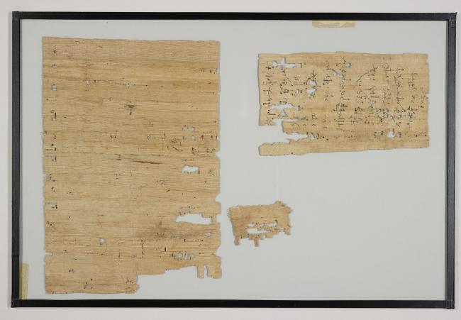 1 pane of glass containing 3 papyrus fragments ; 10.5 x 7 in.; 1.5 x 2.5 in.; 4 x 7 in.