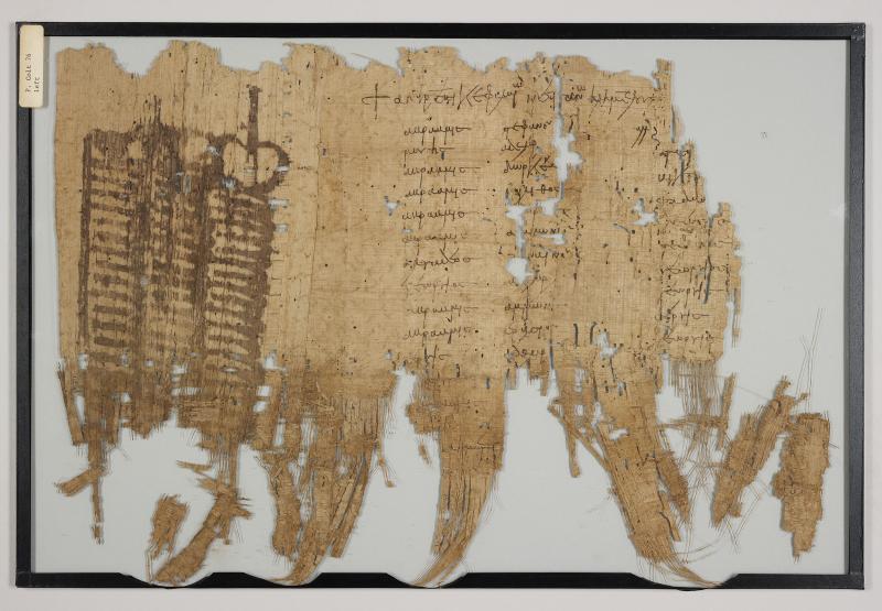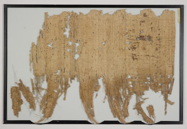 1 pane of glass containing 1 papyrus fragment ; 11 1/2 x 16 inches