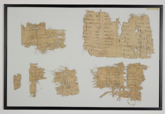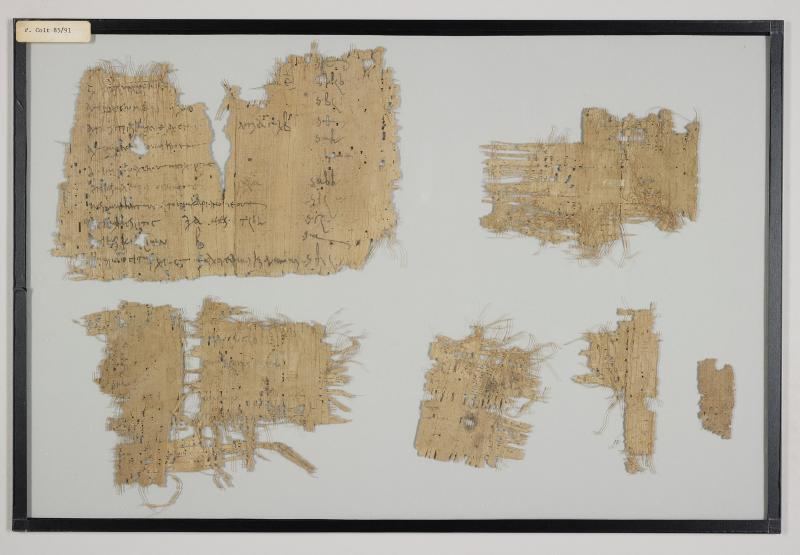 1 pane of glass containing 6 papyrus fragments ; 5 x 8 inches