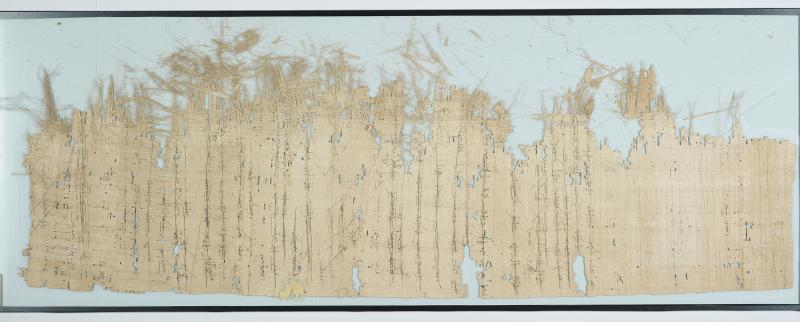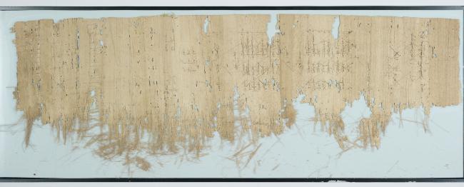 1 pane of glass containing 1 papyrus fragment ; 35 1/2 x 12 inches