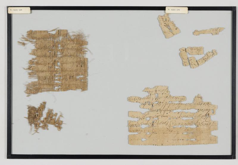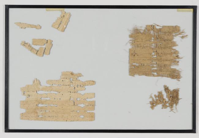 1 pane of glass containing 9 papyrus fragments ; 5 x 5 in.; 5 x 7 in.; 1 x 1 in.