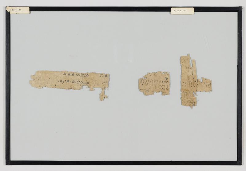 1 pane of glass containing 3 papyrus fragments ; 1 x 6 in.; 2 x 2 in.; 4 x 2 in.