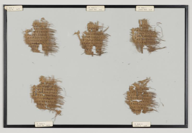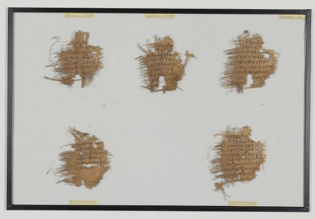 1 pane of glass containing 5 papyrus fragments ; 4 x 4 inches