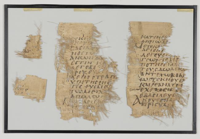 1 pane of glass containing 4 papyrus fragments ; 9 x 5 1/2 inches