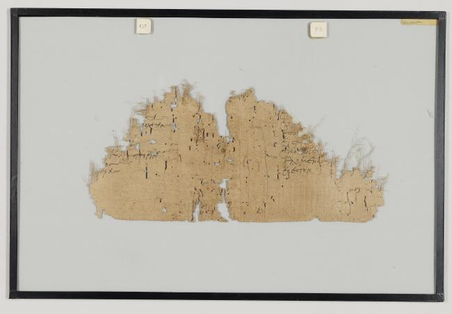 1 pane of glass containing 1 papyrus fragment ; 6 x 12 inches