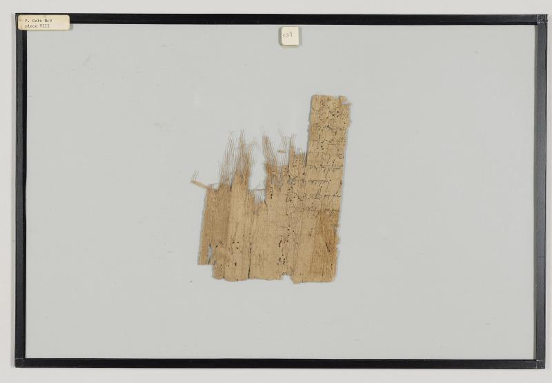1 pane of glass containing 1 papyrus fragment ; 6 1/2 x 5 inches