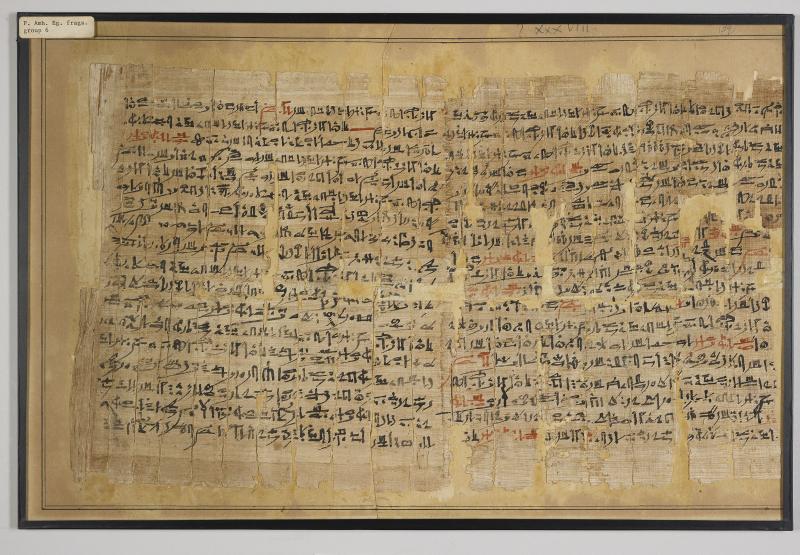1 pane of glass containing 1 papyrus fragment ; 12 x 18 inches