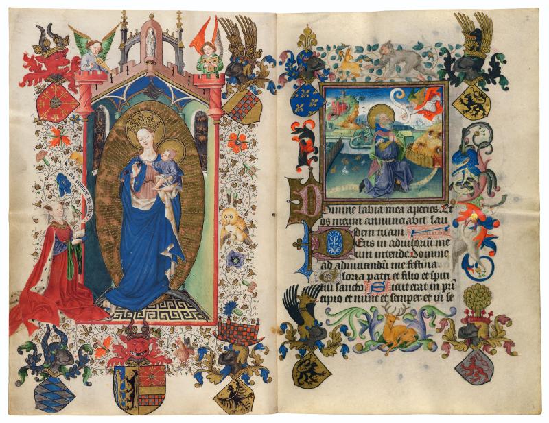 Commissioned by Catherine of Cleves, duchess of Guelders, ca. 1440; sometime before 1856 the manuscript was taken apart, presumably by Jacques Joseph Techener, bookdealer in Paris, who shuffled the leaves and then rebound them into two volumes, making each volume look more or less complete; apparently, both volumes were still in Paris till 1862, when Gruel published Heures du moyen âge, which reproduces vignettes from both volumes. One part was acquired by the Rothschild family in 1855, who kept their manuscripts secret; bought by the Morgan (as "another Hours of Catherine of Cleves") from H.P. Kraus in 1963 (M.917). The other part (M.945, traditionally known as "The Hours of Catherine of Cleves") was put up for auction (by Techener) in London, Sotheby's, 3 Aug. 1858, lot 225 (added to the end of the S.W. Singer sale), where it failed to sell at £435; sold in or after 1862 by Techener (for 15,000 French francs) to Charles, prince of Arenberg (1831-1896); given by him to his wife, Júlia Hunyady de Kéthely (1831-1919); given by her to her husband's nephew, Engelbert Marie, duke of Arenberg (1872-1949) on 24 June 1896; inherited by his son Engelbert Charles, duke of Arenberg (1899-1974); bought from him by H.P. Kraus in 1957; sold by him to Alastair Bradley Martin (1915-2010) for his New York based Guennol Collection; bought by the Morgan through H.P. Kraus in 1970 (M.945). Studying the newly acquired book (MS M.917) along with the Martin volume (later MS M.945), Morgan curator John Plummer determined that they were actually two halves of one and the same codex. In 1964 the Morgan mounted an exhibition of both volumes, displaying all the miniatures via color transparencies. When a facsimile of the manuscript was published by George Braziller in 1966, the exhibition was repeated.