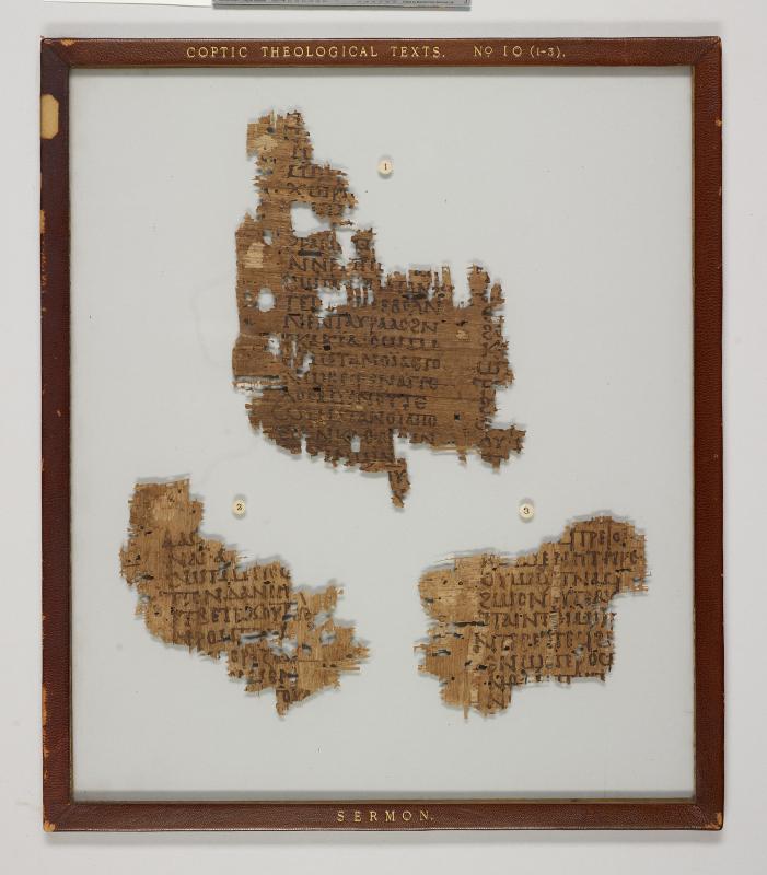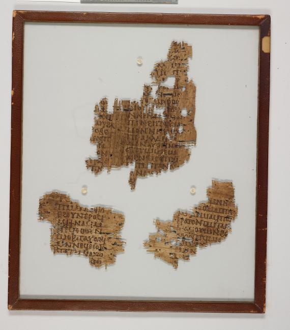 1 pane of glass containing 3 papyrus fragments ; 180 x 134 mm, 108 x 114 mm, 92 x 108 mm