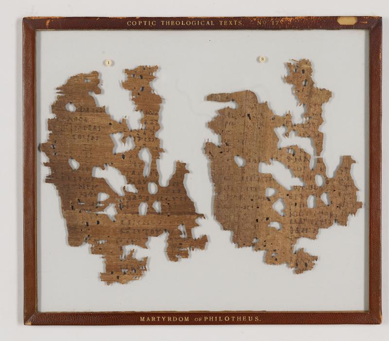 Manuscript fragments from two leaves of a papyrus codex of the martyrdom of St. Philotheus of Antioch; written in Egypt.
