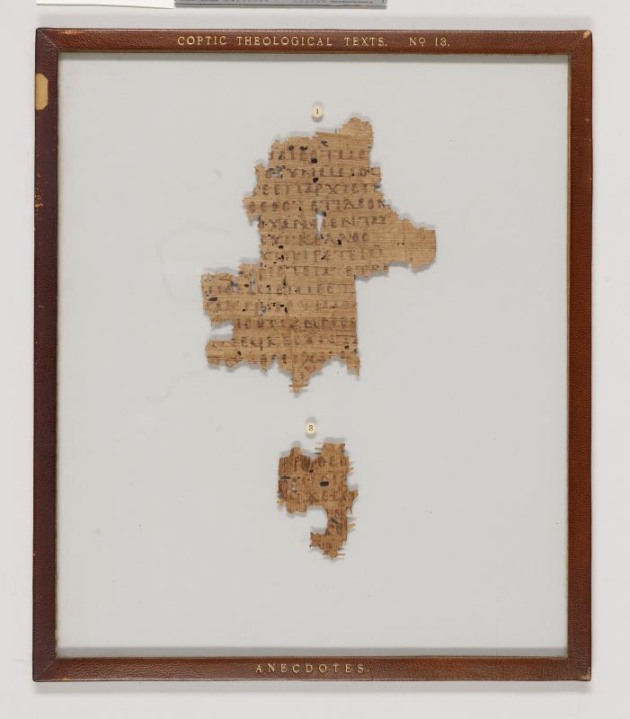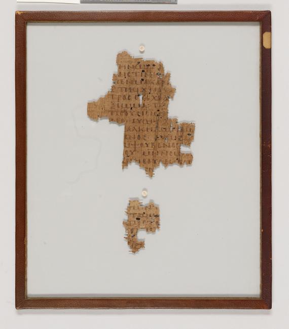 1 pane of glass containing 2 papyrus fragments ; 152 x 130 mm, 65 x 45 mm