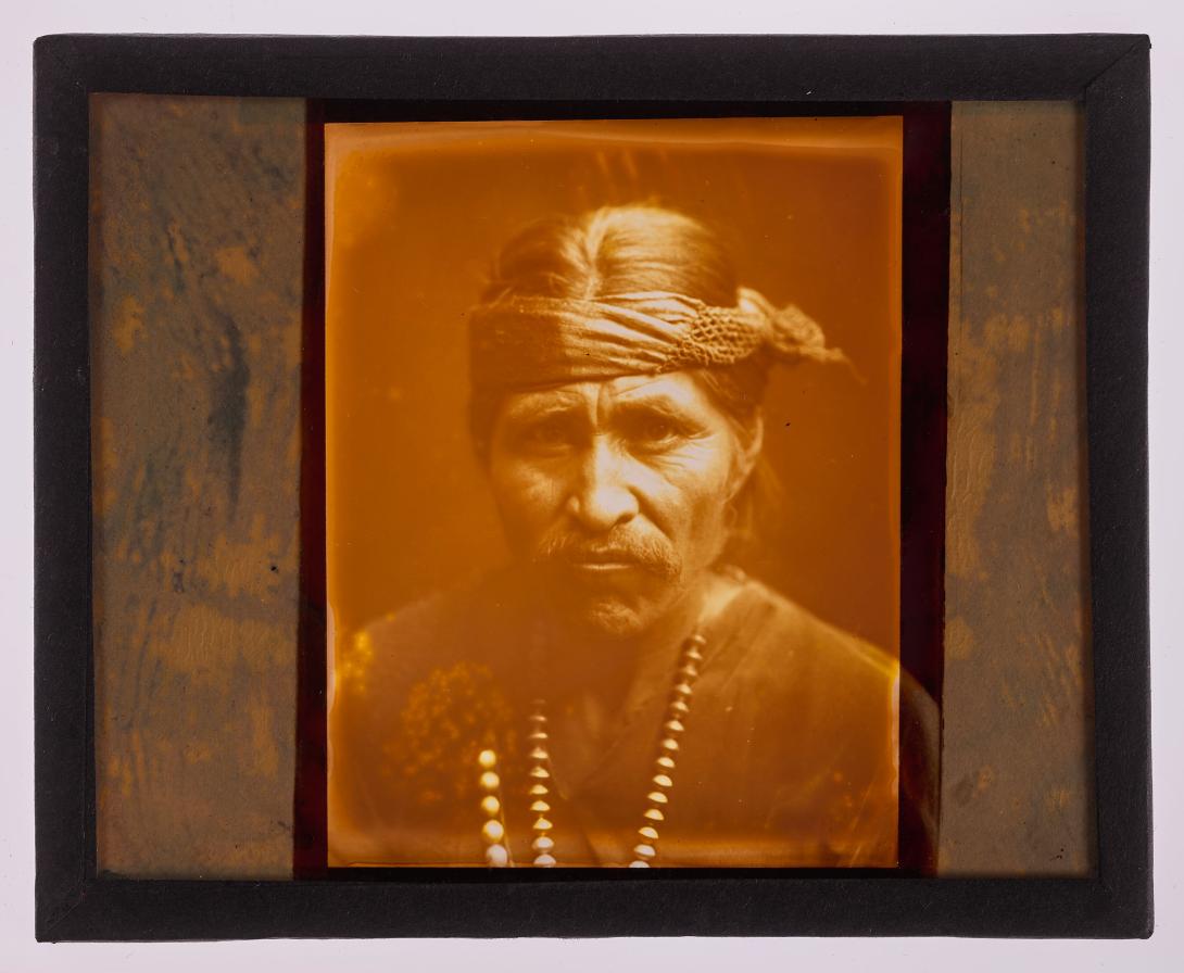 Image also available in the Library of Congress online catalog (viewed May 2021): Edward S. Curtis Collection (Library of Congress), LOT 12311, Library of Congress number 2003652719, dated ©1905 January 6, Curtis negative number 1061-04, title: The laughing singer; summary: Navajo man, head-and-shoulders portrait, facing front, wearing a necklace and a headband.