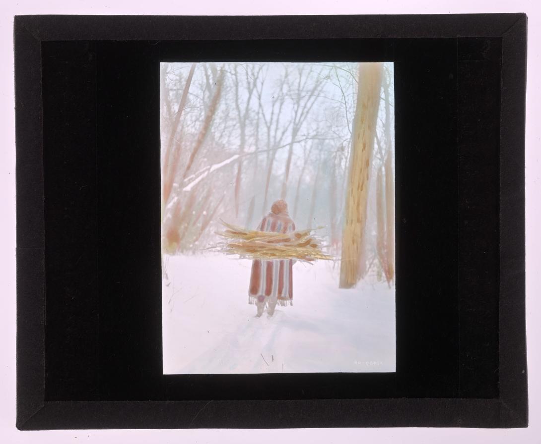 An unidentified woman carrying a bundle of branches on her back and walking through a snowy forest (Dakota/Eastern Sioux).